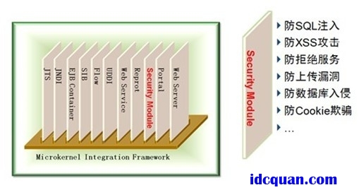 InforSuite云计算中间件采用微内核技术,实现了"背板"架构,安全防护作为InforSuite中间件的一个服务存在,实现了web应用层面的攻击防护能力,比如防SQL注入、防XSS攻击等,InforSuite安全防护服务架构如图3所示。