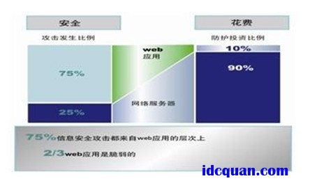 根据全球最权威的IT研究与顾问咨询公司Gartner的报告,目前有75%的信息安全国内国际都来自web应用层面,但是目前有2/3的web应用是不安全的,但是目前投入web应用层的防护投资比例仅占10%,如图2所示。