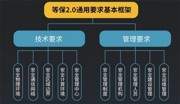 等保2.0新标准名称由原来的《信息安全技术 信息系统安全等级保护基本要求》变更为《信息安全技术 网络安全等级保护基本要求》,与《中华人民共和国网络安全法》保持一致。等级保护对象由原来的“信息系统”改为“等级保护对象(网络和信息系统)”,包括基础信息网络(广电网、电信网等)、信息系统(采用传统技术的系统)、云计算平台、移动互联、物联网和工业控制系统等。新版安全要求在原有通用安全要求的基础上新增安全扩展要求,安全扩展要求主要针对云计算、移动互联、物联网和工业控制系统提出了特殊安全要求。等保2.0通用要求基本框架也原来大不相同,如下图所示。