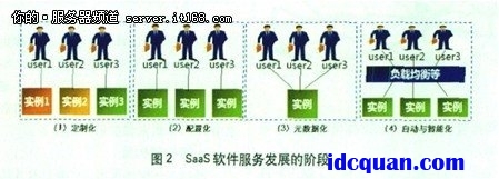 云计算IDC 对外提供业务和服务的最高形式为SaaS服务,IDC依托PaaS平台提供各类SaaS应用,在提供SaaS服务的同时捆绑了IaaS服务。如图2所示,业界普遍认为SaaS软件服务的发展分为定制化、配置化、元数据化、自动与智能化4个阶段。