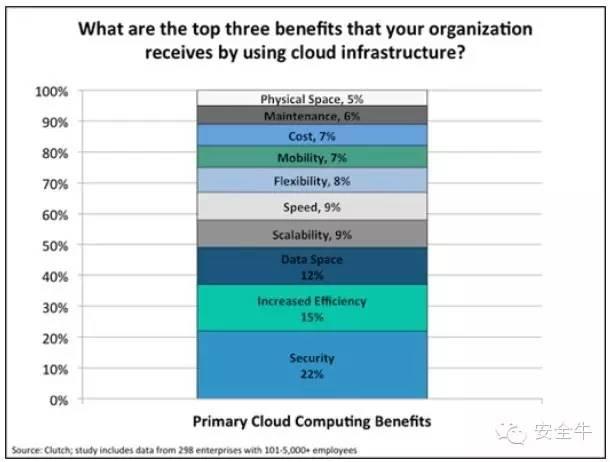 大体来说,几乎半数(47%)的公司企业都认为效率提升是云计算带来的主要好处。但是,若被要求对云计算的各项特性排个序,且有一项强调的是云计算带来的主要好处,那么,安全位居首位。