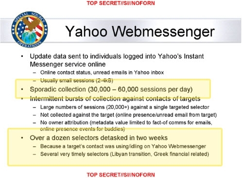 《华盛顿邮报》的记者透露,仅从雅虎邮箱,美国情报机构一天就能够窃取近50万联络地址。据统计,美国国家安全局还对聊天网站进行监控。经调查,用户登陆时,网站会自动将其通信内容传至美国情报部门。而电脑与手机等其他设备同步的人,他们保存在电脑硬盘内的全部信息都会流入美国情报部门之手。