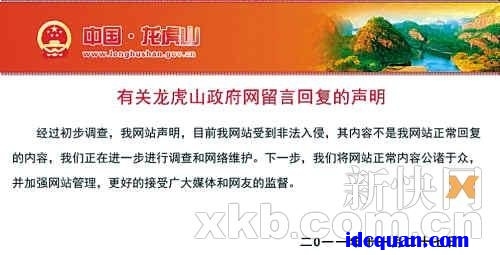 27日凌晨,网友发现龙虎山政府官网上出现了“雷人回复”,一时众多网友前往围观。虽然官方很快删除了“问题回复”,表示并非工作人员所为,是网站遭到入侵,并发布了“已报警方进行调查”的声明。
