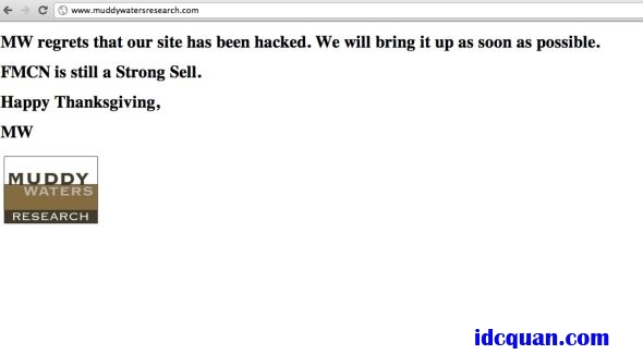 中国IDC圈11月23日报道:知名做空机构浑水研究(Muddy Waters)的网站遭到了黑客攻击,目前该网站的页面上显示:“我们的网站遭到了黑客攻击,我们将尽快回复正常运行。我们对分众传媒的评级依旧是强烈卖出。祝大家感恩节快乐。浑水。”
