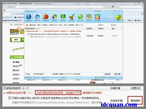 记者随即打开IE浏览器,将返利网(51fanli.com)保存至IE浏览器后,开始360查杀木马病毒,不久,页面上弹出“可疑收藏夹网址返利网”、“直接删除”等查杀字样。