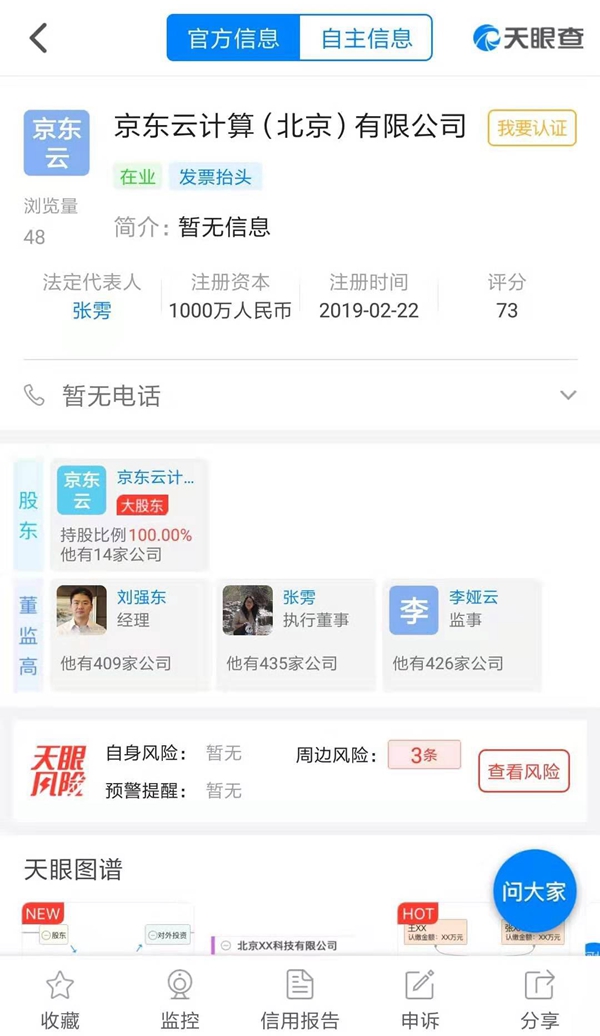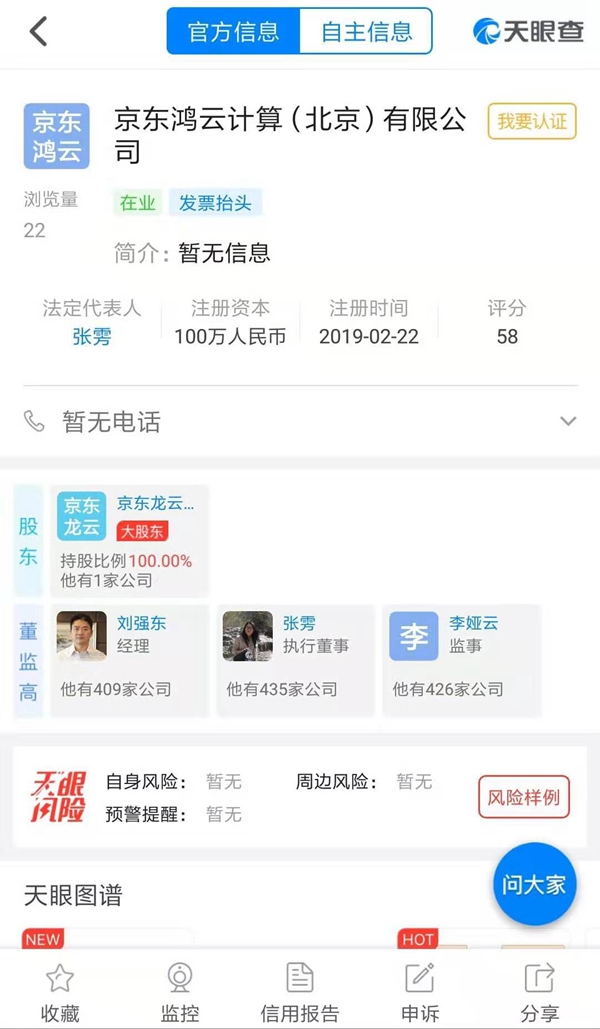 北青报记者今天通过天眼查查询到,京东在2月22日新注册了两家云计算公司,分别为京东云计算(北京)有限公司和京东鸿云计算(北京)有限公司。这两家公司注册地址都在翠宫饭店,经营范围包括“数据处理、计算机系统服务等”。