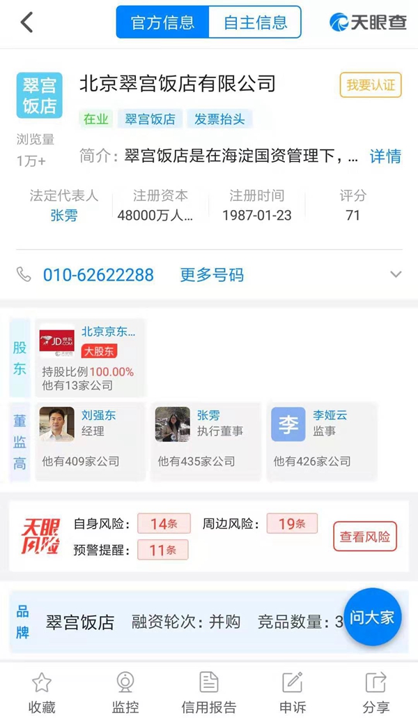 本月初京东斥资27亿元收下翠宫饭店后,副总裁宋旸曾通过社交平台表示,“(京东买翠宫)不是为开酒店,也不是为了开发布会,就是用做办公场地”。他表示,“目前京东在北辰的部分研发兄弟会搬过去,在西边安置办公场所也更方便吸纳研发人才”。北京青年报记者今天查询到,在京东拿下翠宫饭店仅仅半个月后,已经在翠宫饭店注册了两家技术研发新公司。